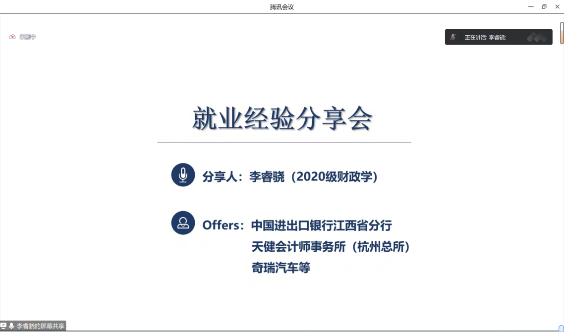 李睿骁分享了中国进出口银行的求职经验,包括报考时间线、银行招考流程等,并就求职方面给出了一些建议。他建议同学们应明确求职目标,根据求职方向完善简历,并且多与同学交流、多跑宣讲会以获得更多就业信息,使自己处在更主动的位置。