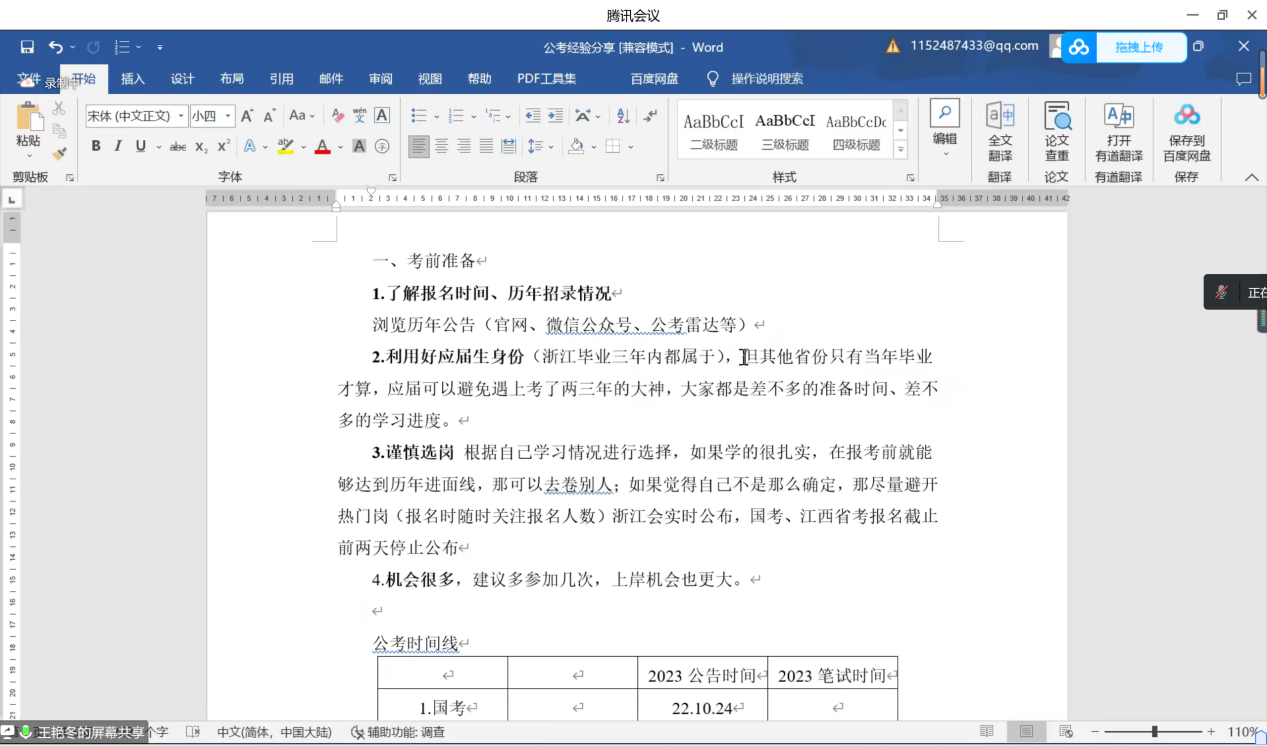 王艳冬分享了公务员考试的备考经验。她就考前准备、笔试备考以及面试备考三方面按照时间顺序进行了详细的介绍,具体包括考公时间线、学习经验、做题技巧和面试心态等。谈韦晨就考公的十个常见问题进行了解答,例如岗位选择、考公与论文的协调兼顾等,以亲身经历鼓励同学们敢于尝试,不断摸索,积极备考。