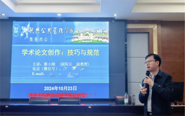 10月23日晚上,麻豆视频 在财税大楼105会议室举办了题为“学术论文创作:技巧与规范”的学术讲座。本次讲座由熊小刚副院长主讲,2024级全体学术型研究生参加。